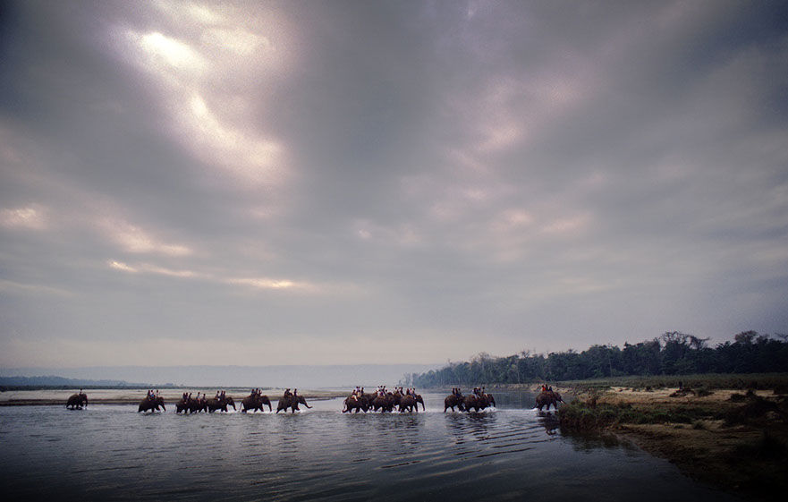 Nepal: Elephants and mahouts taking their animals to the river at sunset in order to bathe. These elephants are used a tour vehicles to watch rhinos and tigers in Chitwan National Park.