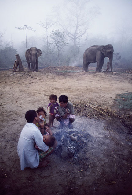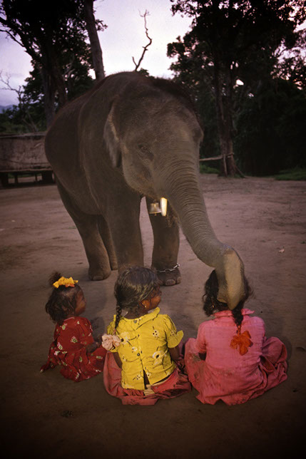 In this Nepalese mahout home the young animals wander around, although chained. The children are brought up with these beasts in a manner similar to our growing up with our pets.