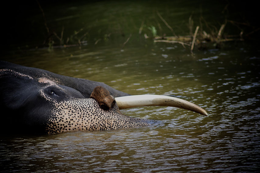 Sri Lanka. The elephant is taking an afternoon snooze and keeping cool at the same time.
