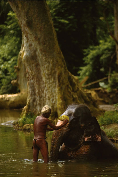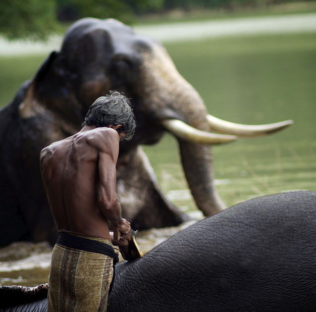 The elephant is being bathed and scrubbed using coconut husks. The elephants love this as it clears away any parasites as well as the dirt of a workday. Of course, the temperatures in India and Sri Lanka are high and this is very cooling... the elephants love the river and often simply go to sleep in the water as the mahouts scrub away.