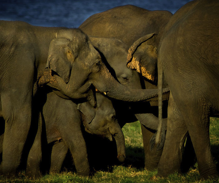 Sri Lanka. The females in the herd of elephants prodigiously protect their young.