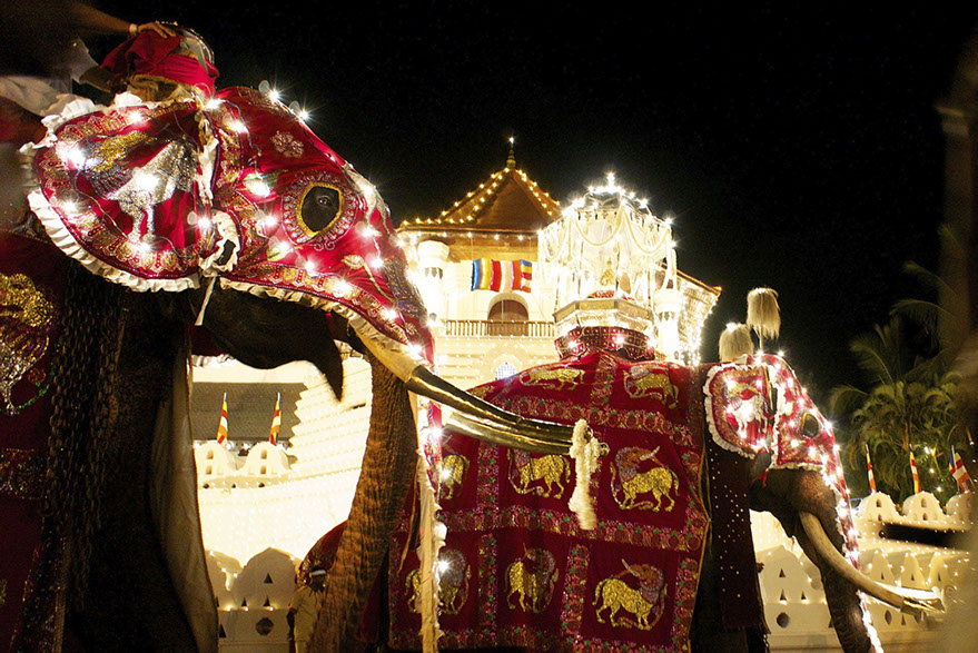 Kandy, Sri Lanka. The Perahera is a vast festival of elephants that takes place each August on the full moon. It is an extraordinary event with literally hundreds of elephants covered in lights and beautiful fabrics participating. It only takes place at night.