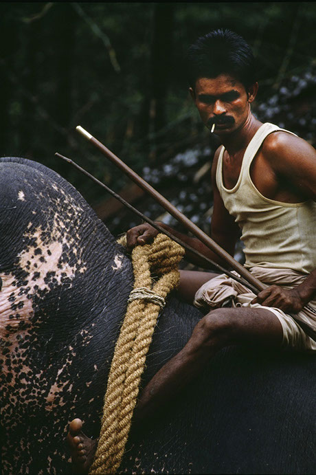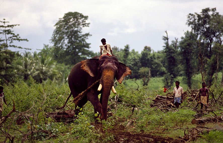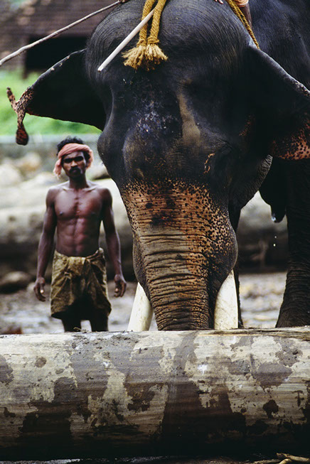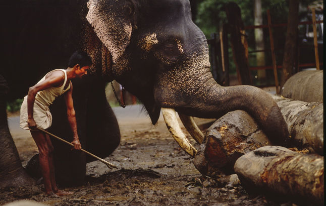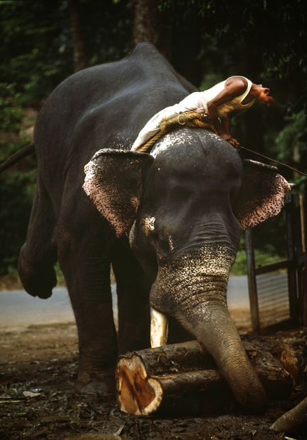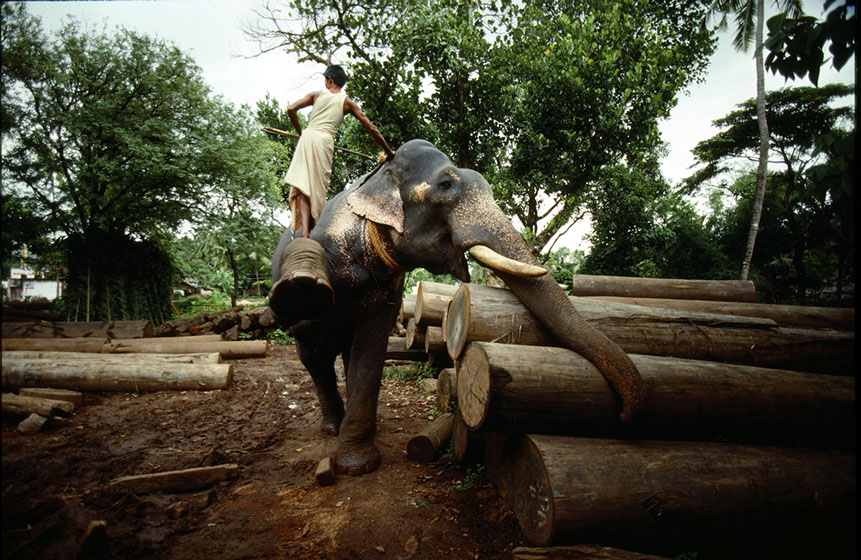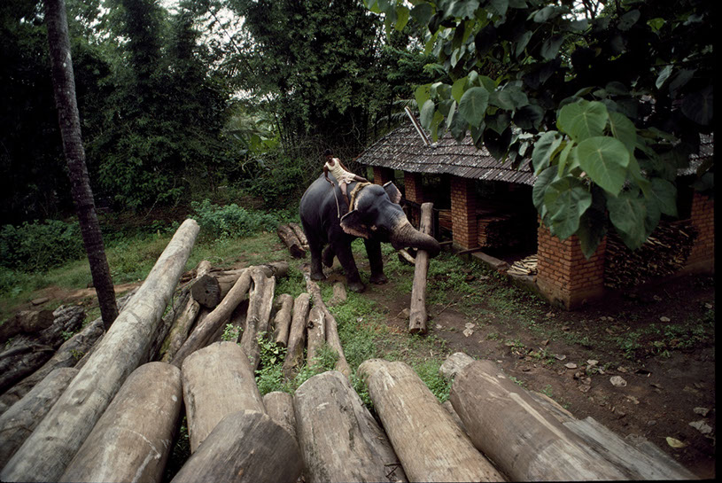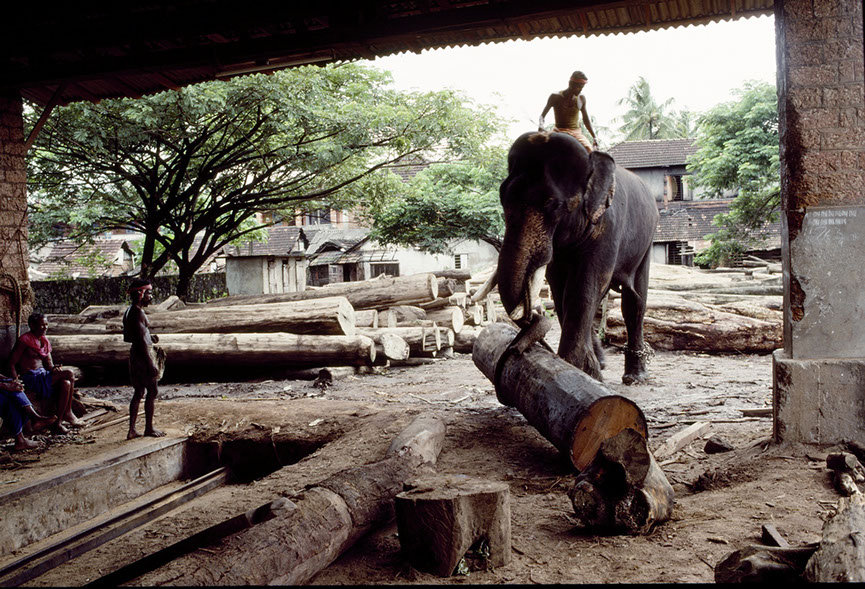 Southern India. Elephants can life massive logs. And, I have observed them doing this kind of lifting all day in horrendous heat. At the end of the day, the mahouts take their elephants to a local river for a wash and relaxation. What is interesting in watching this lumber yard activity is that the elephant knows what to do, how to wrap the chains and ropes around the logs... all done with its trunk and with little pressure from the mahout.