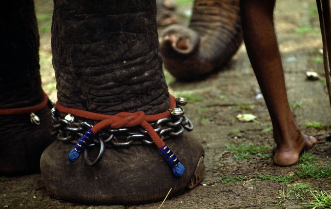 Chained to keep the animal from wandering into the jungle to forage at night. She is quite happy to stand here and have the food brought to her rather than spending the night looking for fodder, often in the villagers fields which has, more often than not, disastrous consequences of the elephant.
